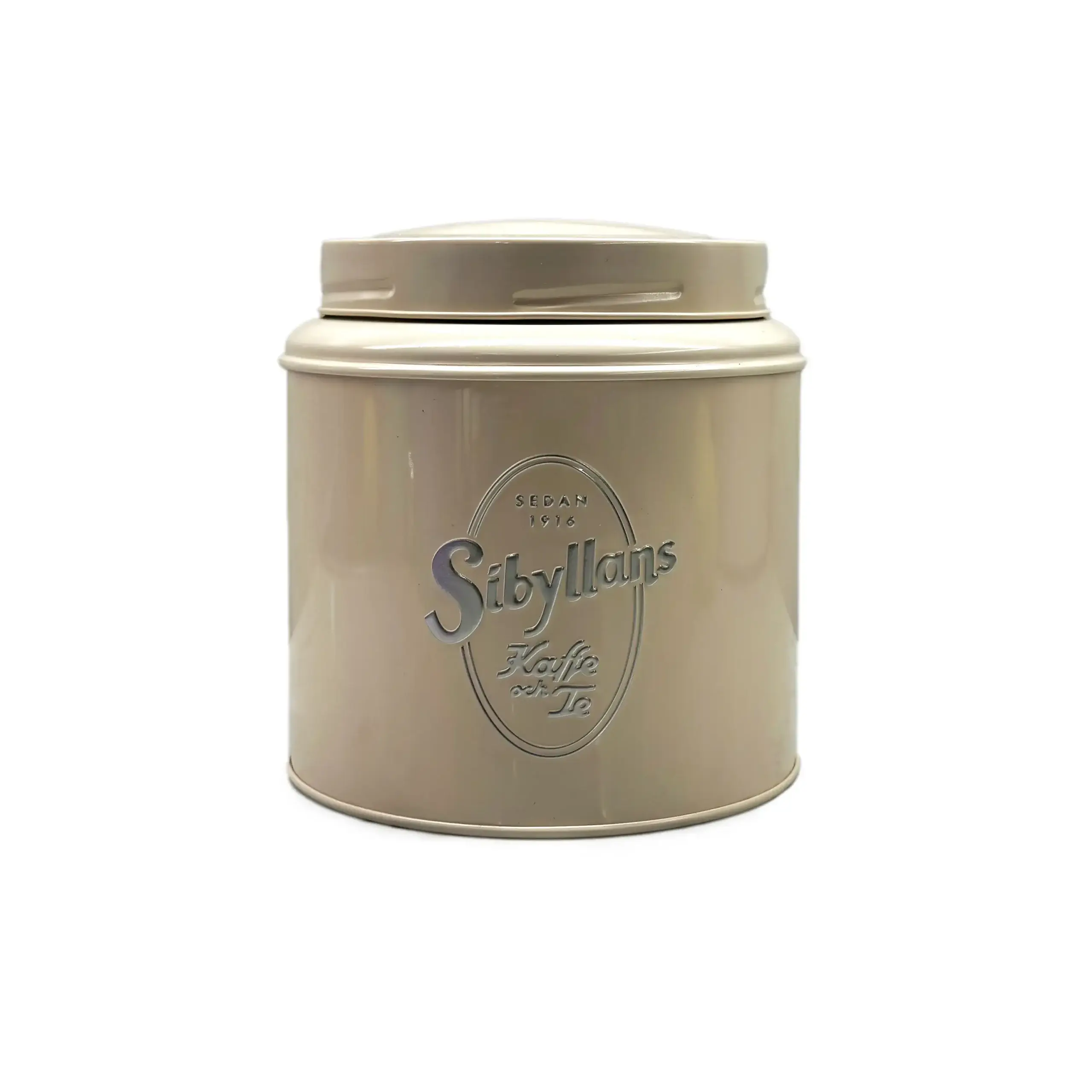 Sibyllans populära plåtburk i beige färg och Sibyllans i silver. Stapelbar. Stor rymmer ca 500 gram och liten ca 250 gram.