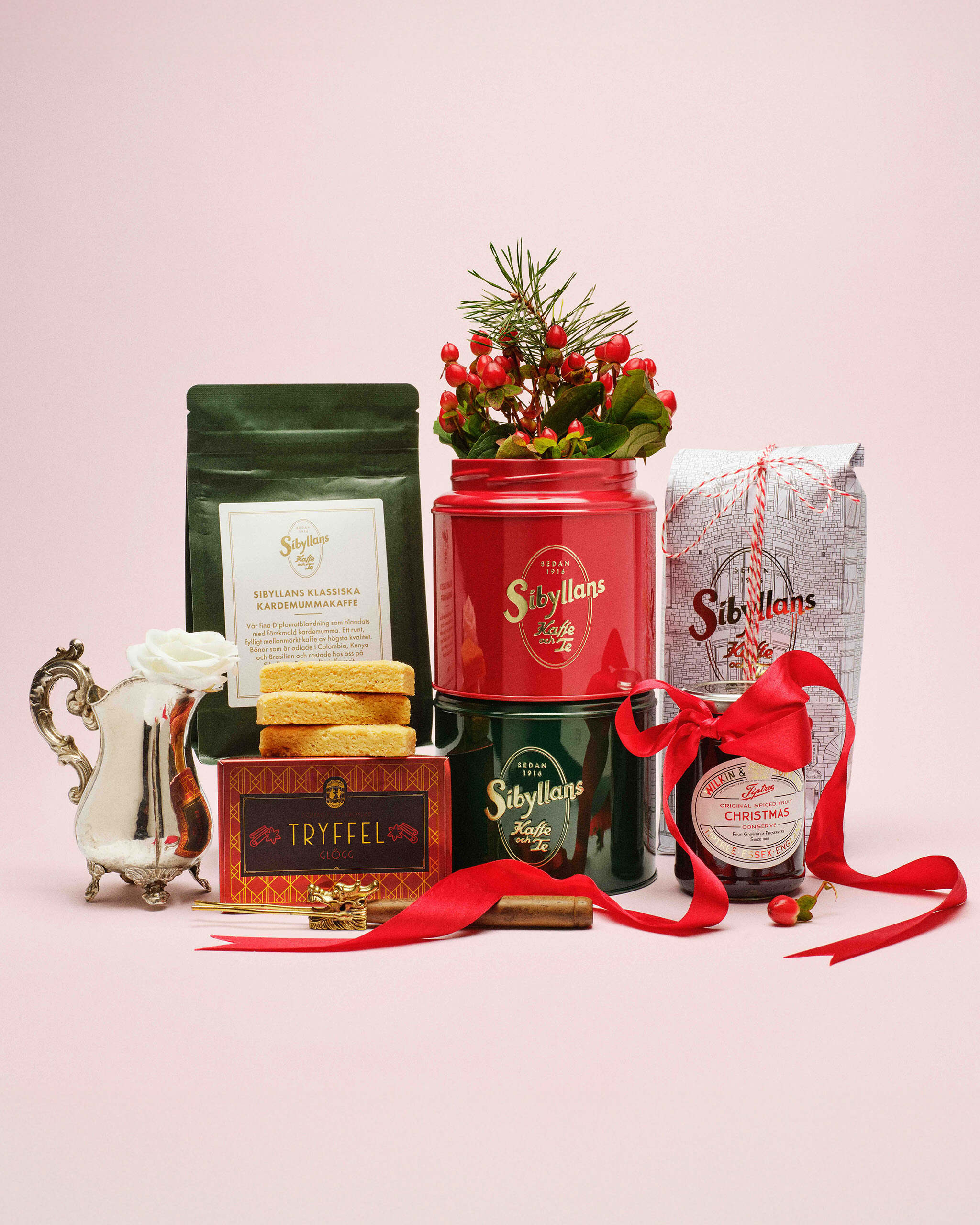 En perfekt present till julens alla fester. Innehåller: två stycken små burkar, 2 hg Sibyllans Svarta julte, 250 gram Sibyllans klassiska kardemummakaffe bryggmalet, en god engelsk marmelad från Wilkin & sons, ett paket kakor Shortbread och en ask med fantastisk goda glöggtryfflar. 799 kr (ord pris 812 kr).
